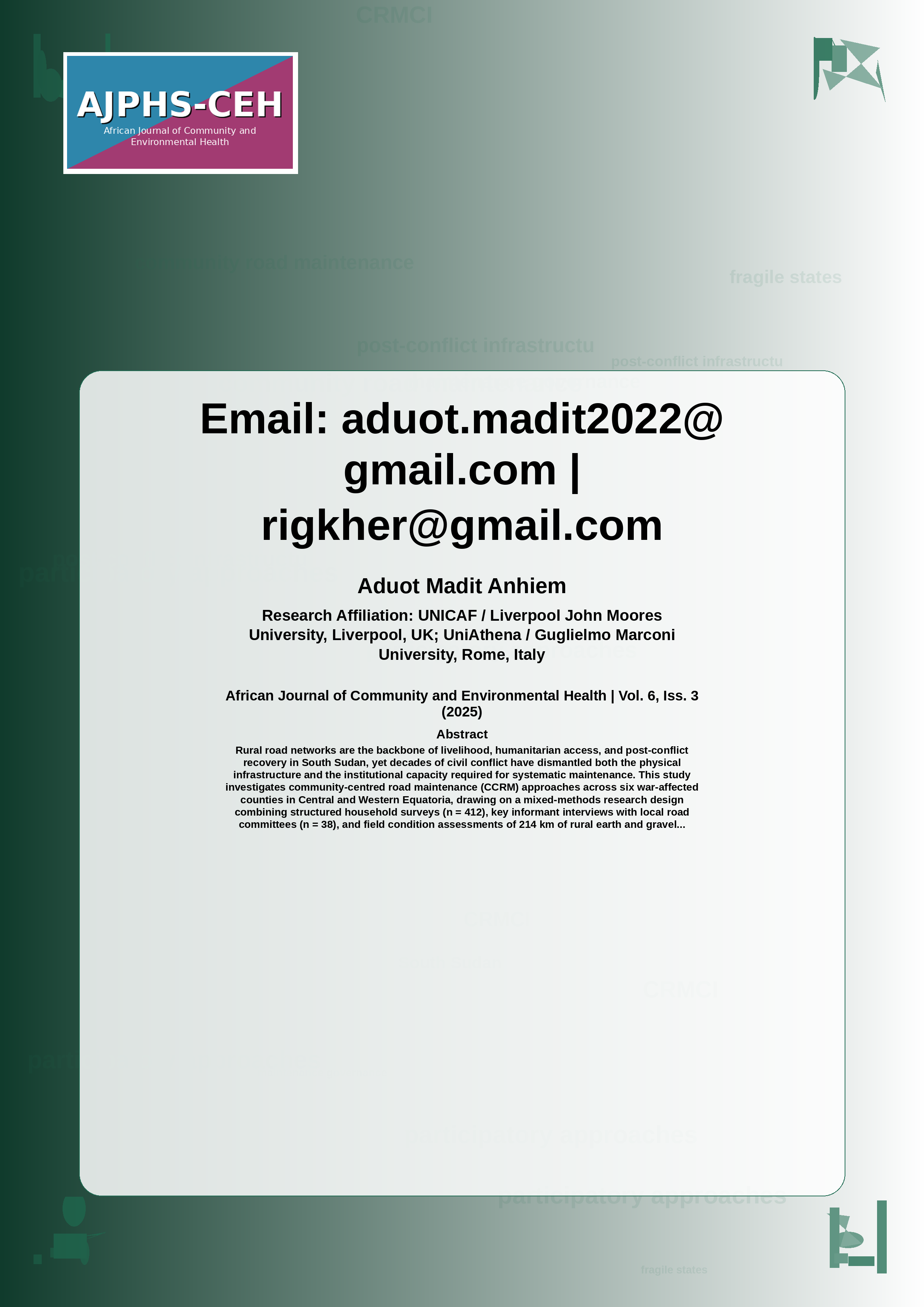 This issue of African Journal of Community and Environmental Health (Volume 6, Issue 3, 2025) presents peer-reviewed contributions with practical and methodological relevance, spanning theoretical advances, applied analyses, and context-specific evidence.
